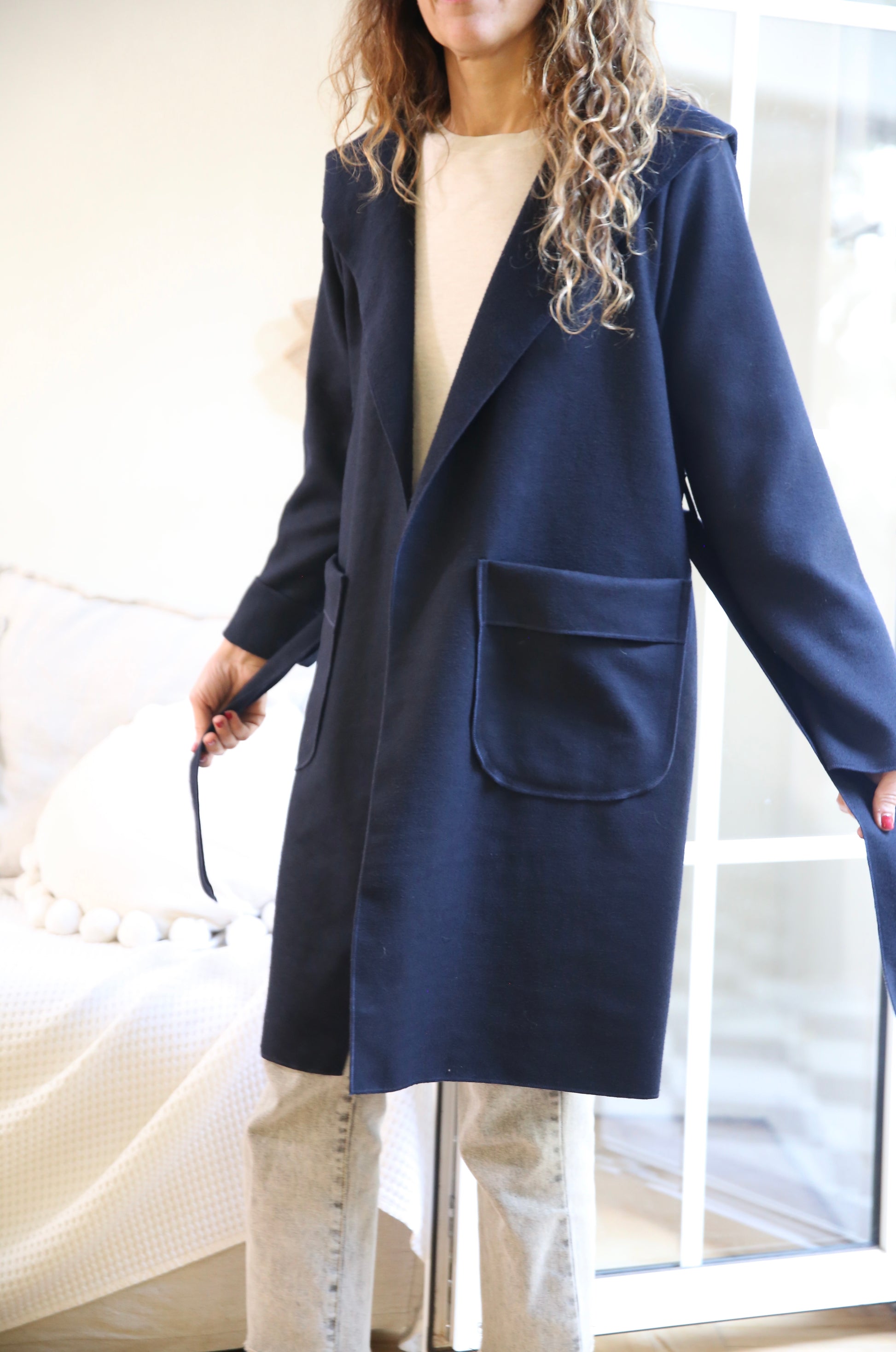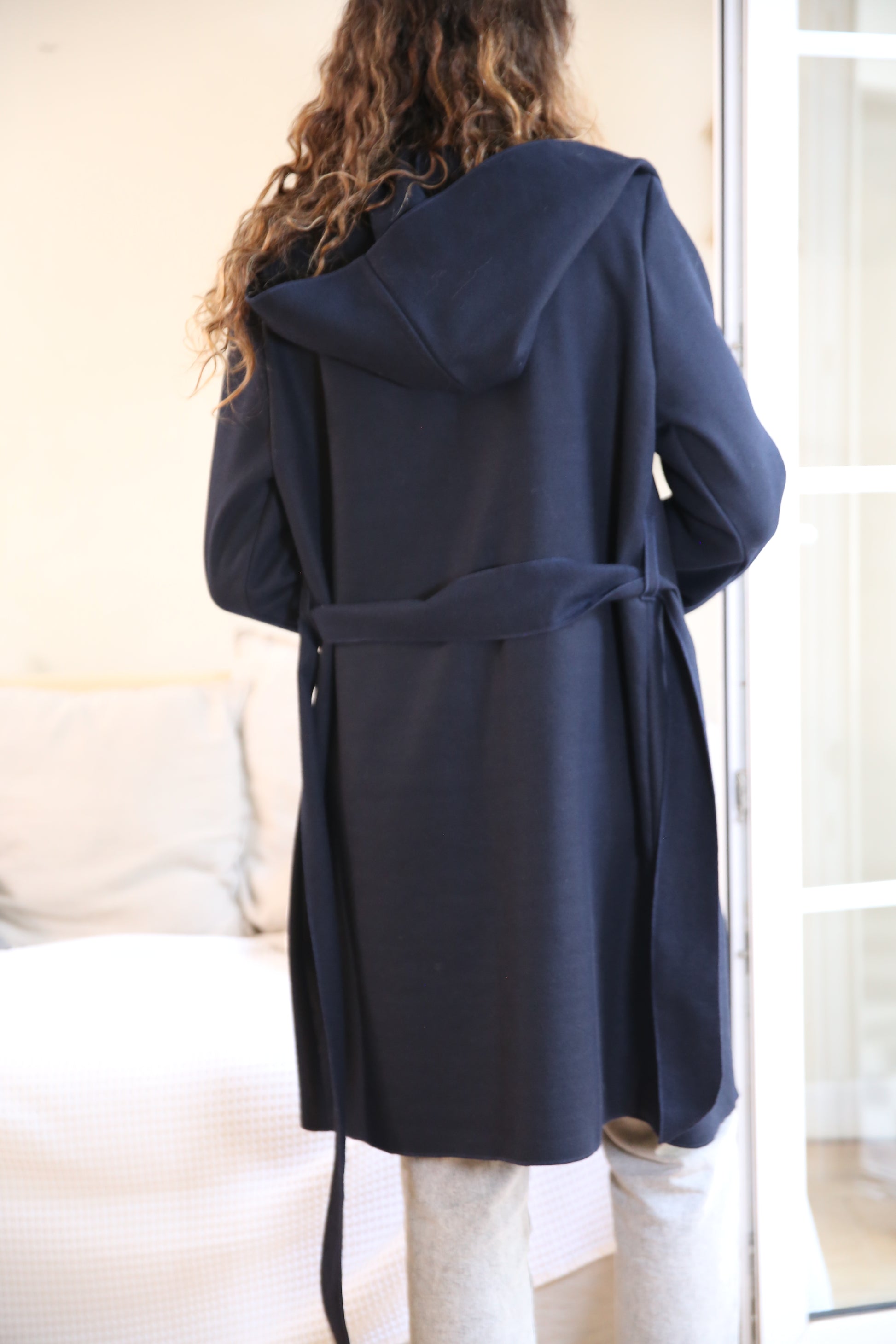 Abrigo largo estilo oversize con capucha, bolsillos y amarra que permite ajustarlo a las diferentes tallas.