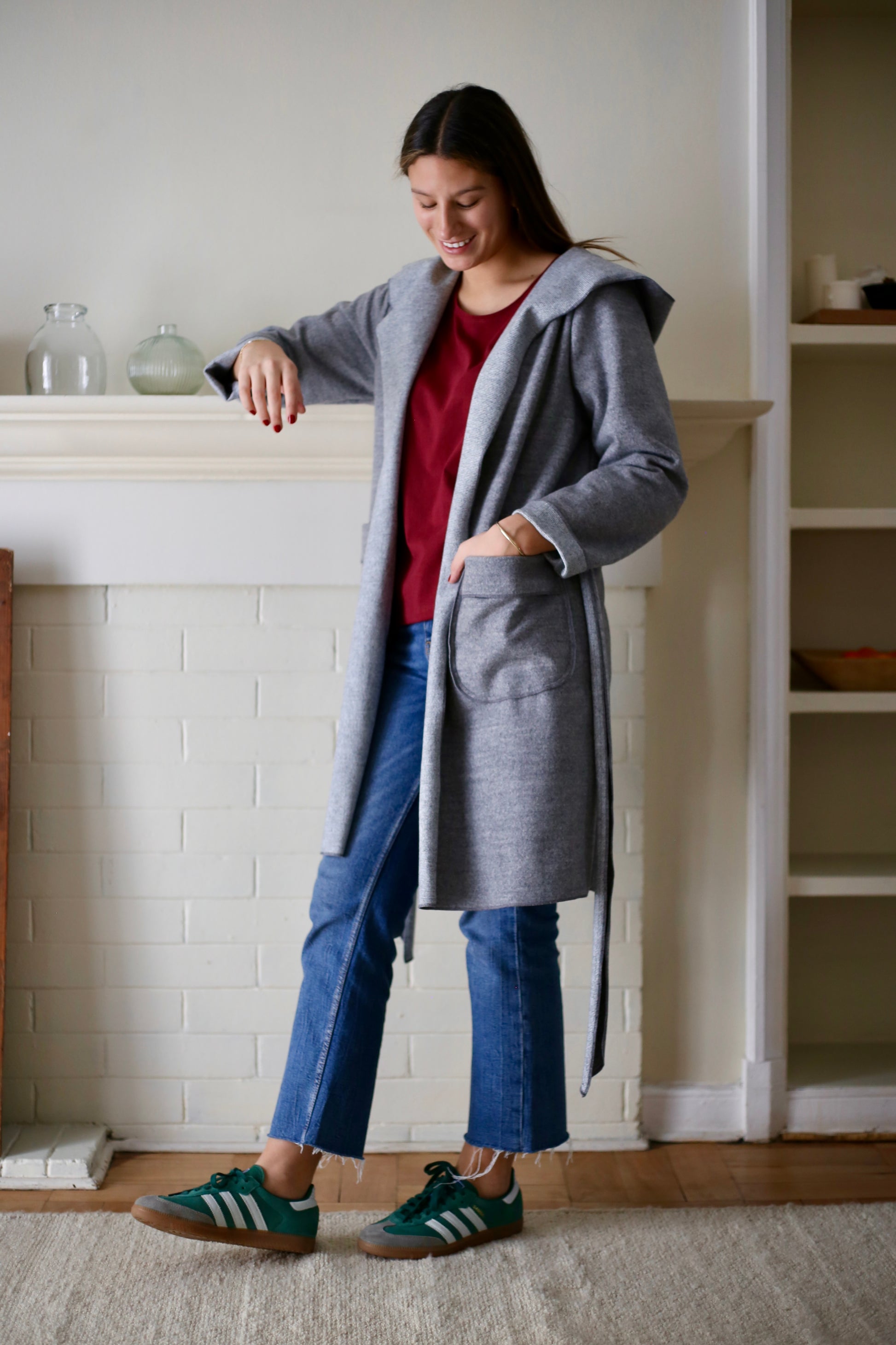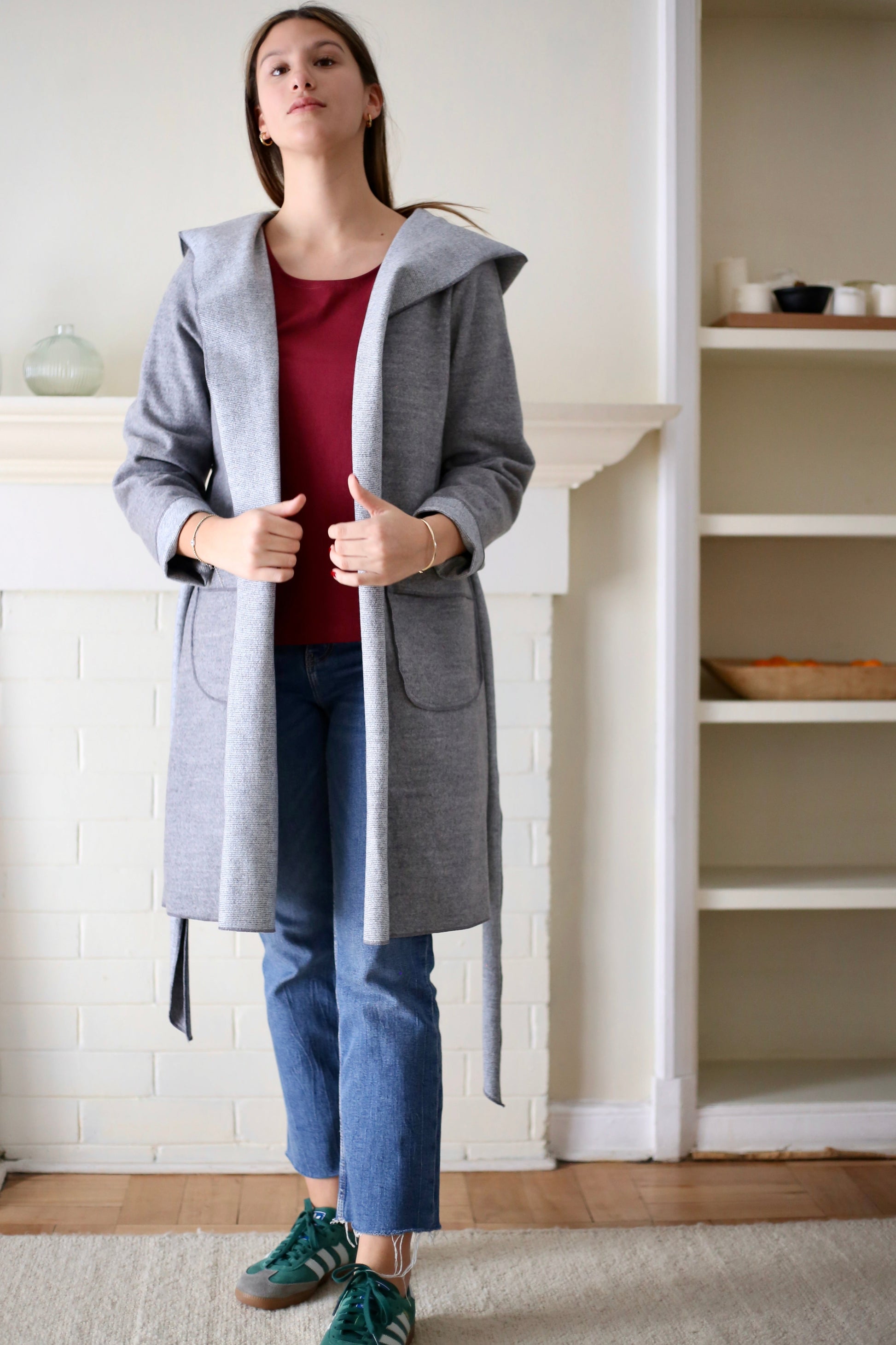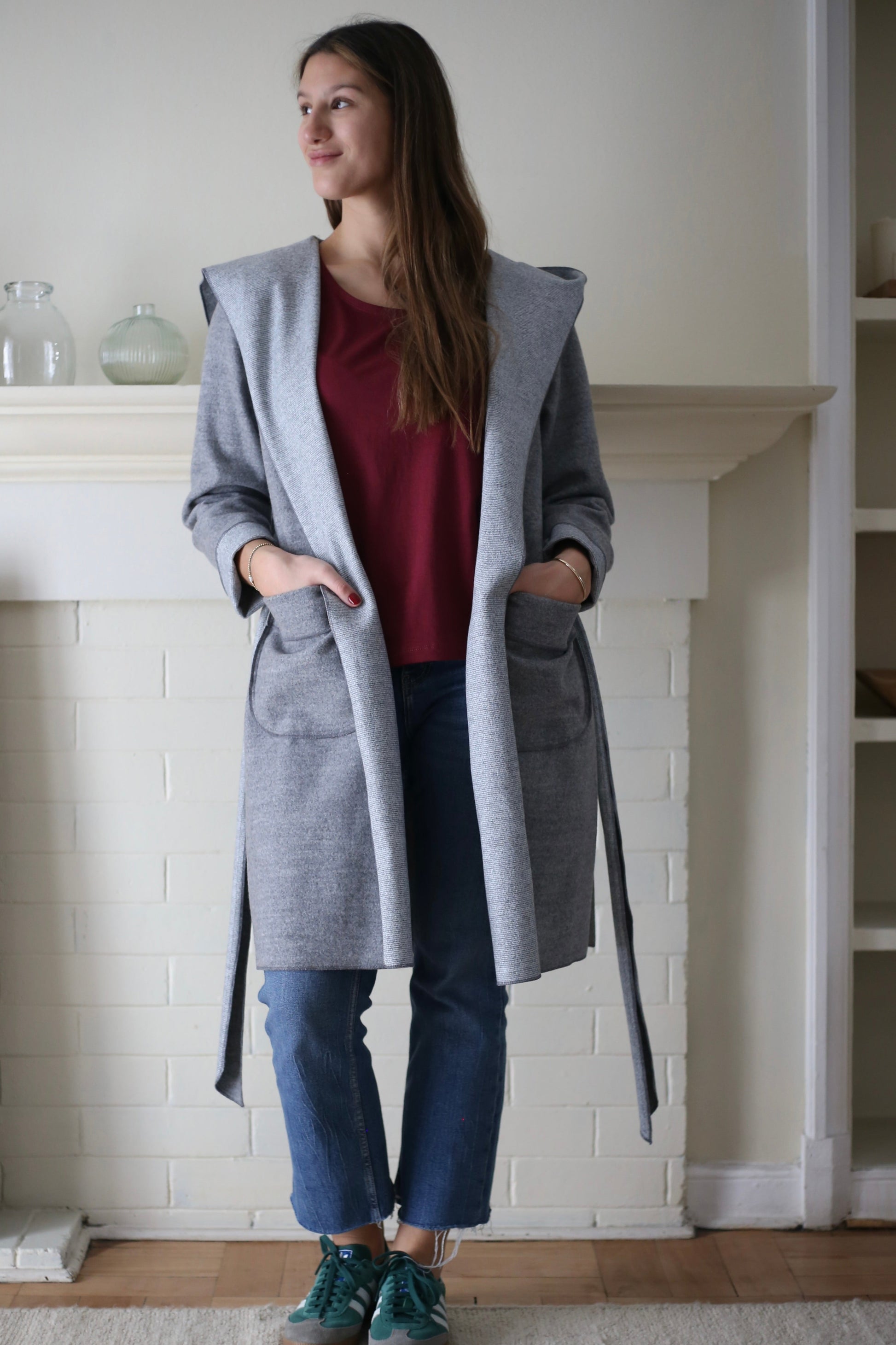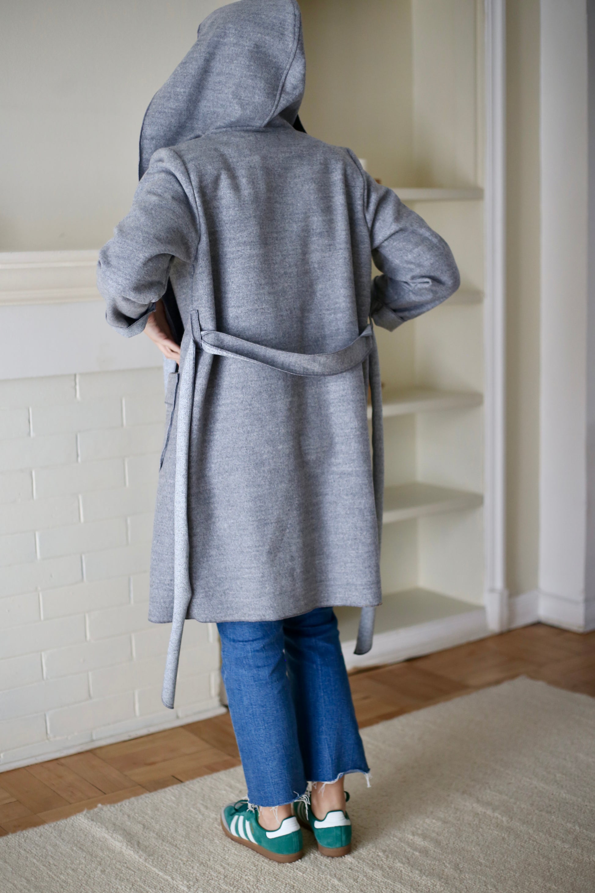 Abrigo largo estilo oversize con capucha, bolsillos y amarra que permite ajustarlo a las diferentes tallas.