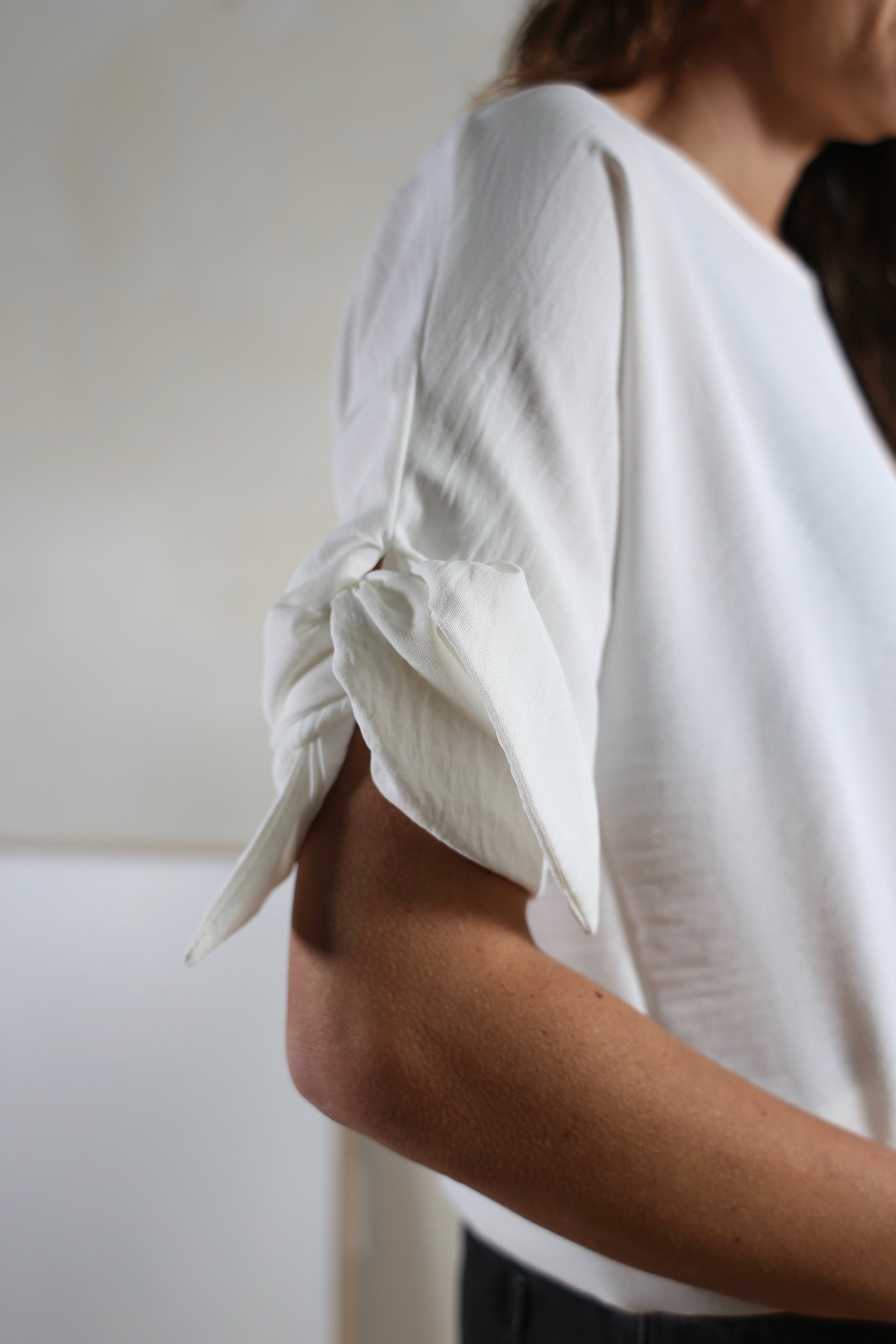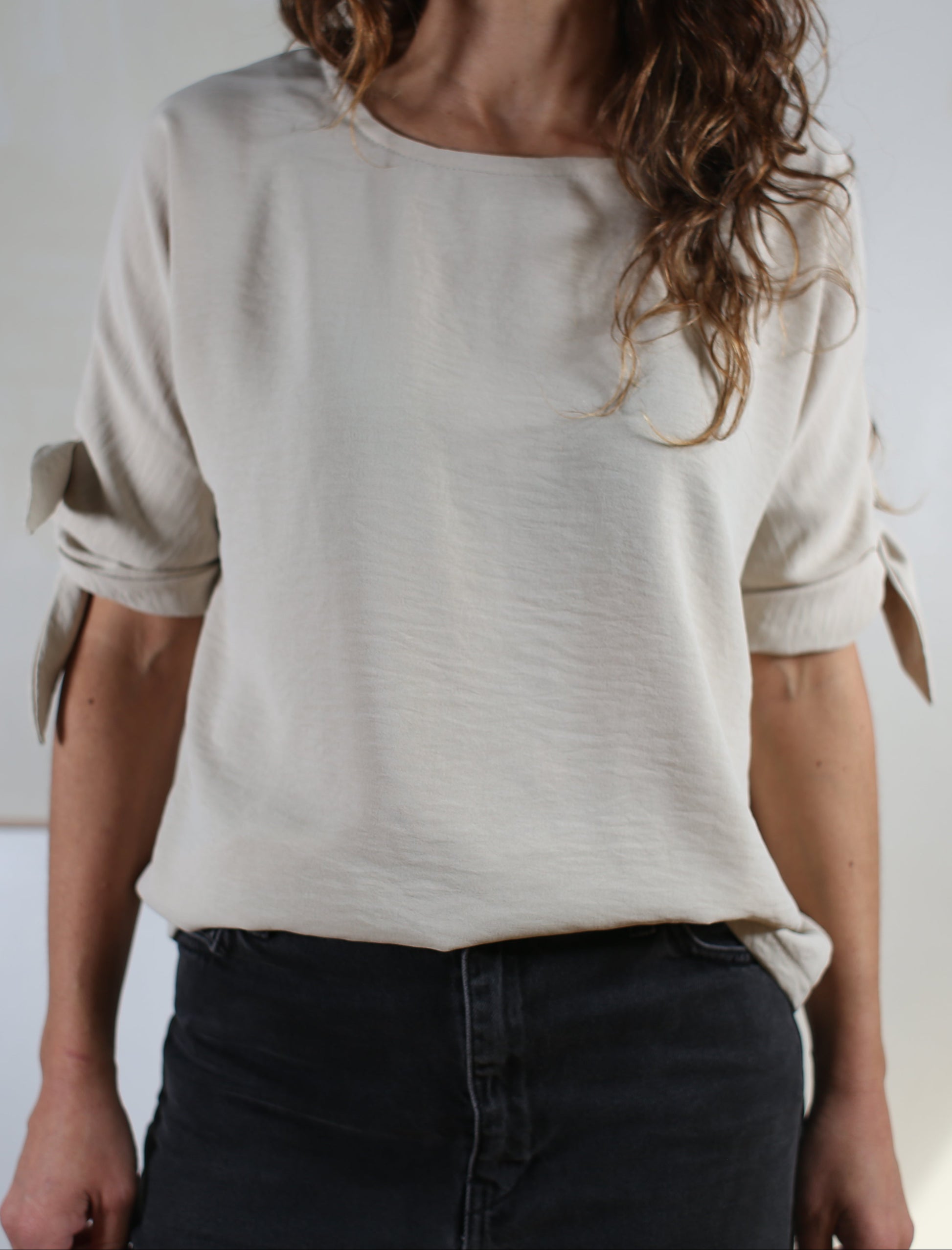 Blusa manga 3/4 tela fresca, liviana y con movimiento. Detalle de amarra en sus mangas y detalle con boton en la espalda. Ideal para usarlo como tenida para la oficina o tenida más formal, se puede usar ablusada adentro o suelta afuera.