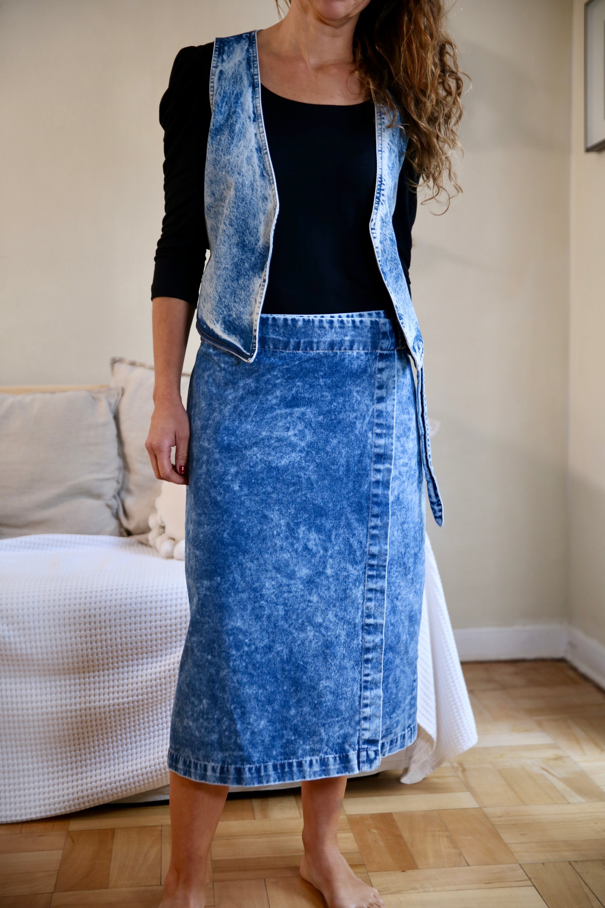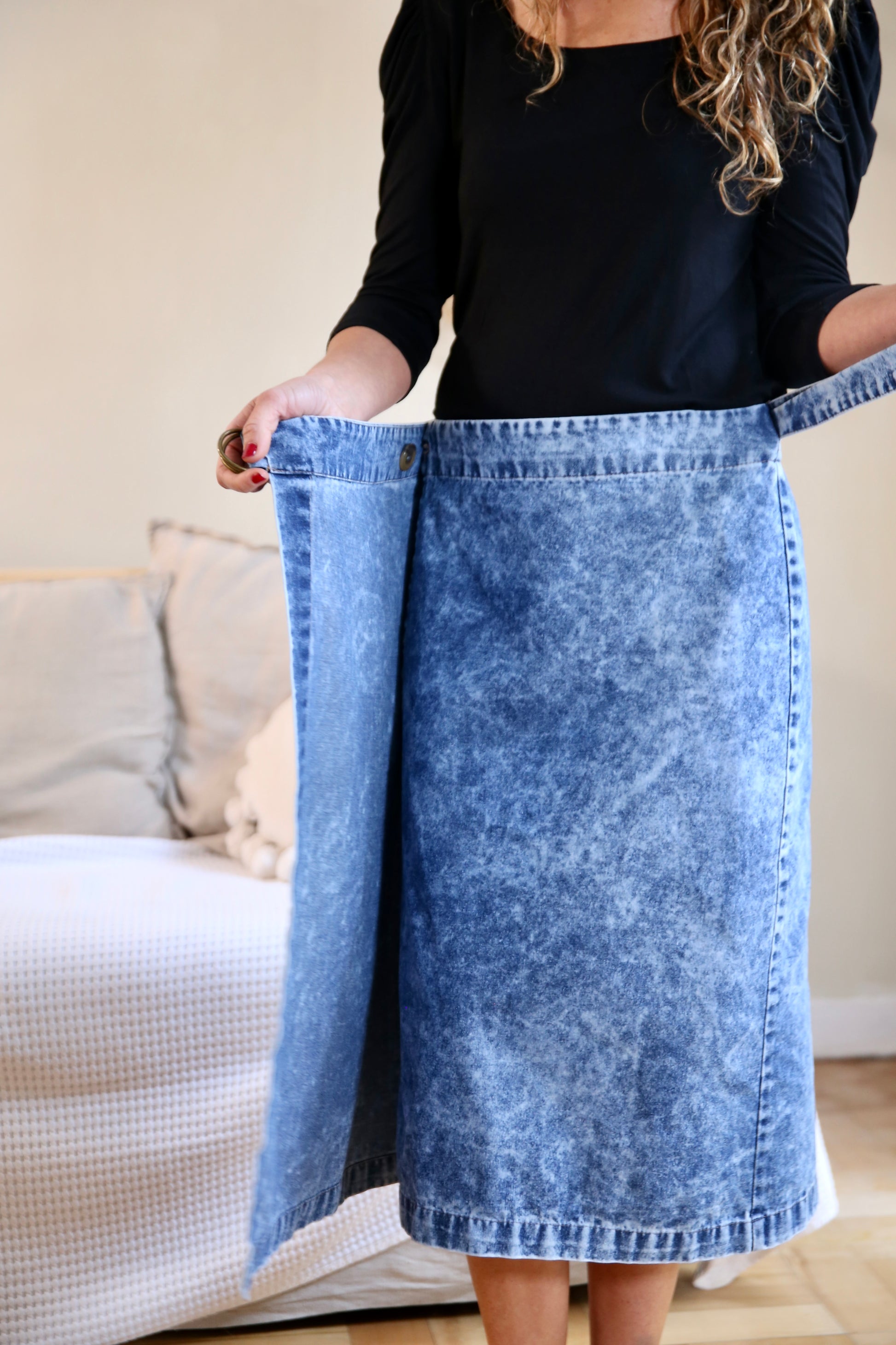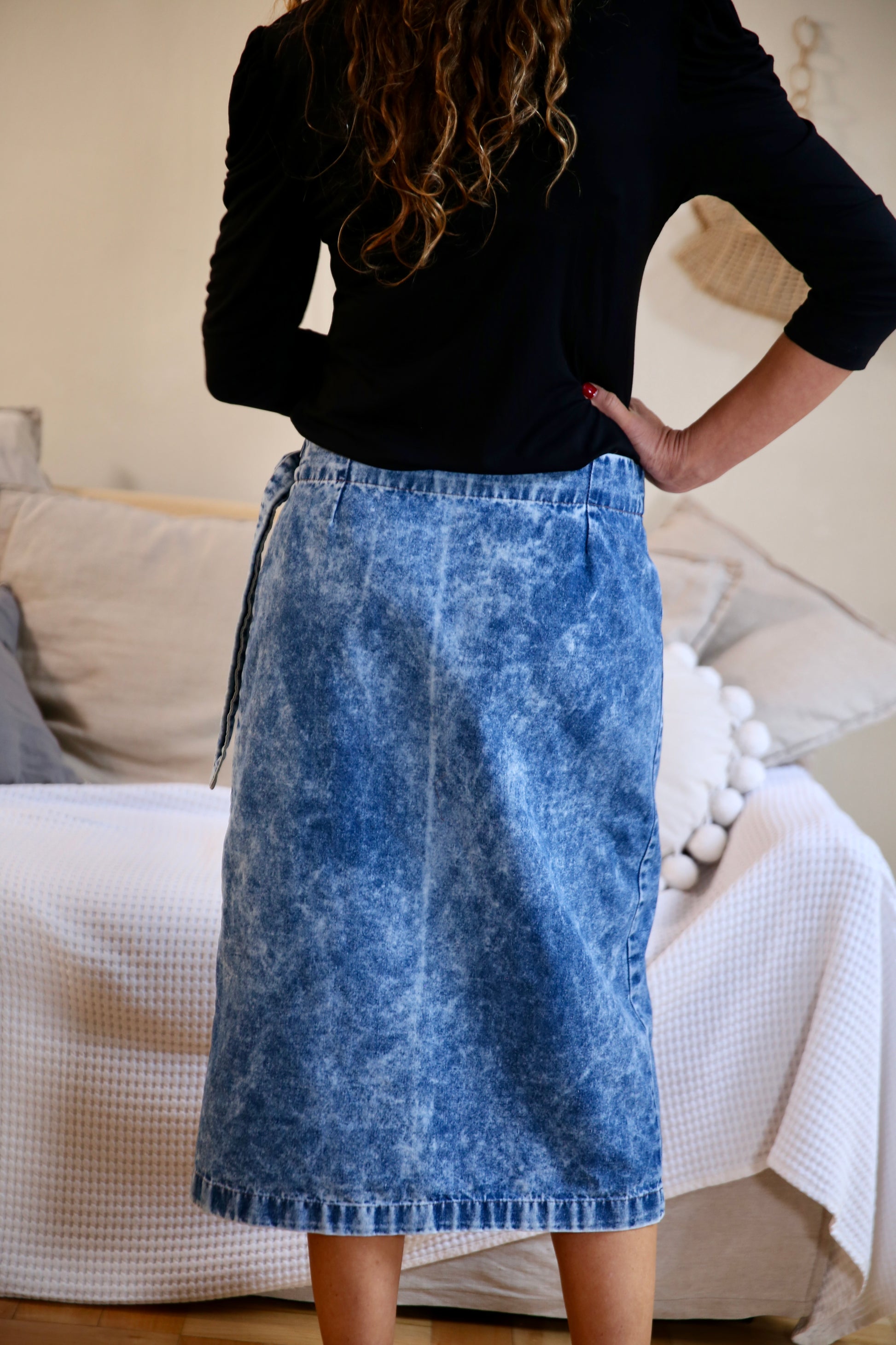 Falda envolvente de jeans con amarra y hebilla en bronce, que permite adaptarse a cada cuerpo. Combínala para este invierno con calzas, botines o ballerinas y arma el conjunto con nuestro vest de jeans Estocolmo.