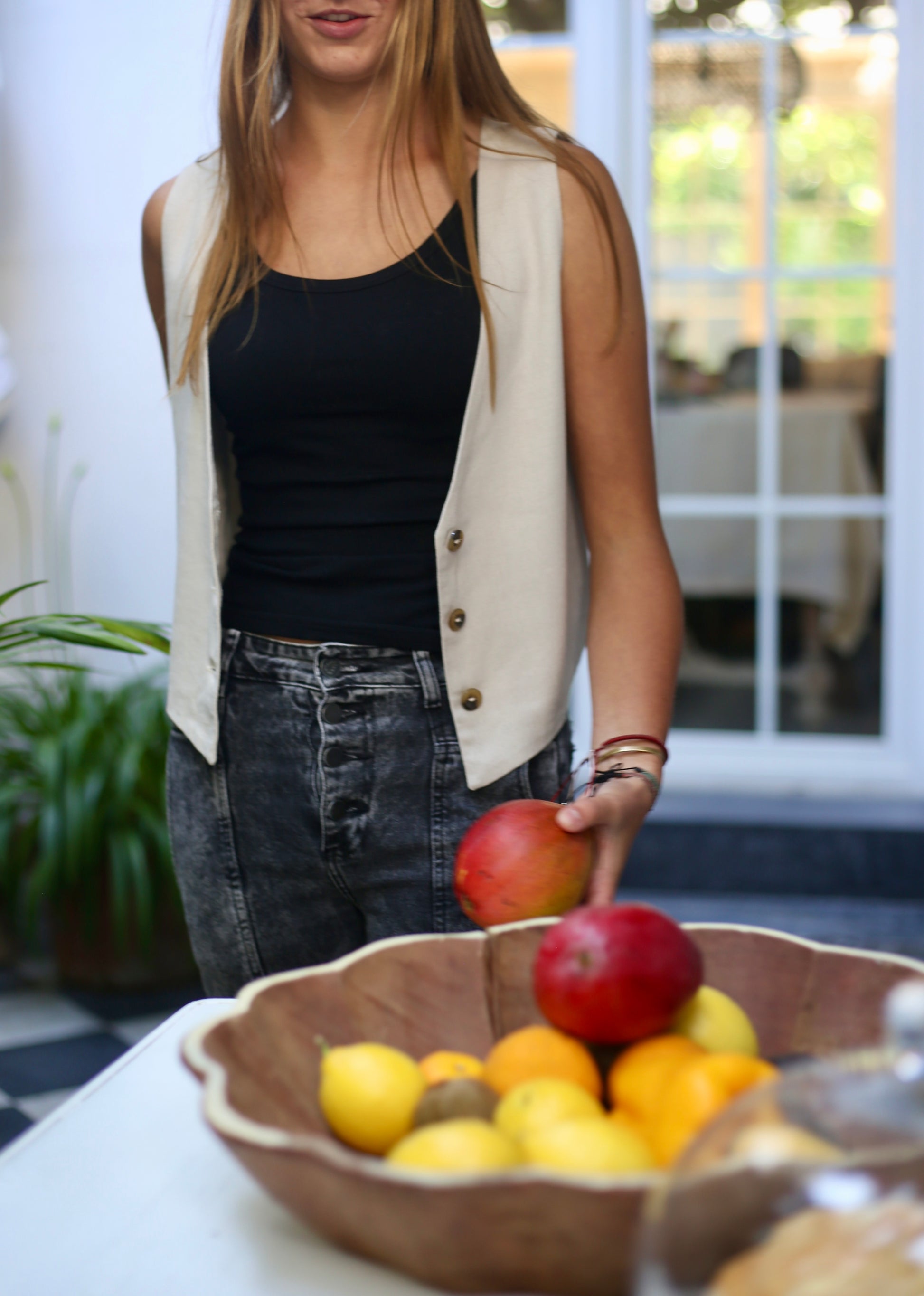 Vest en lino algodón, un toque perfecto para complementar tus tenidas de primavera-verano. Su escote pronunciado es perfecto para combinarlo con petos o poleras ajustadas abajo, o también es un buen complemento usarlo abierto, para tus tenidas. Tiene una hebilla en la parte posterior que permite ajustarlo y entallarlo