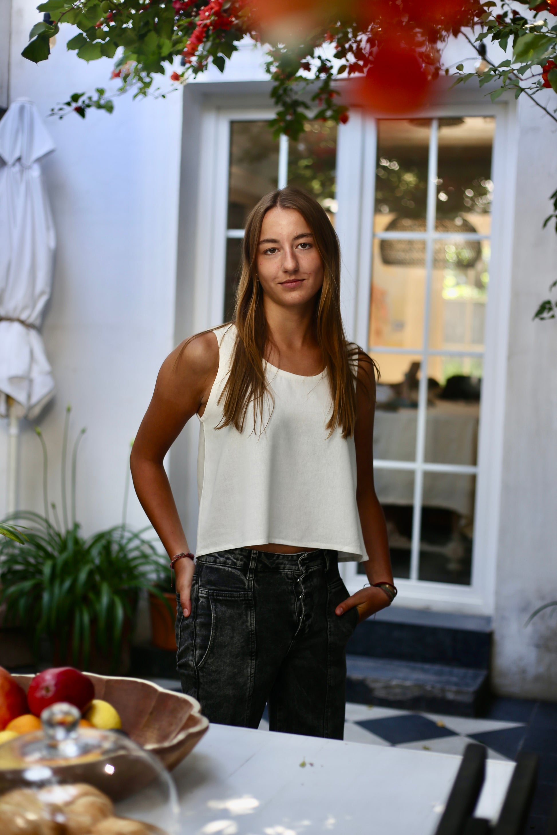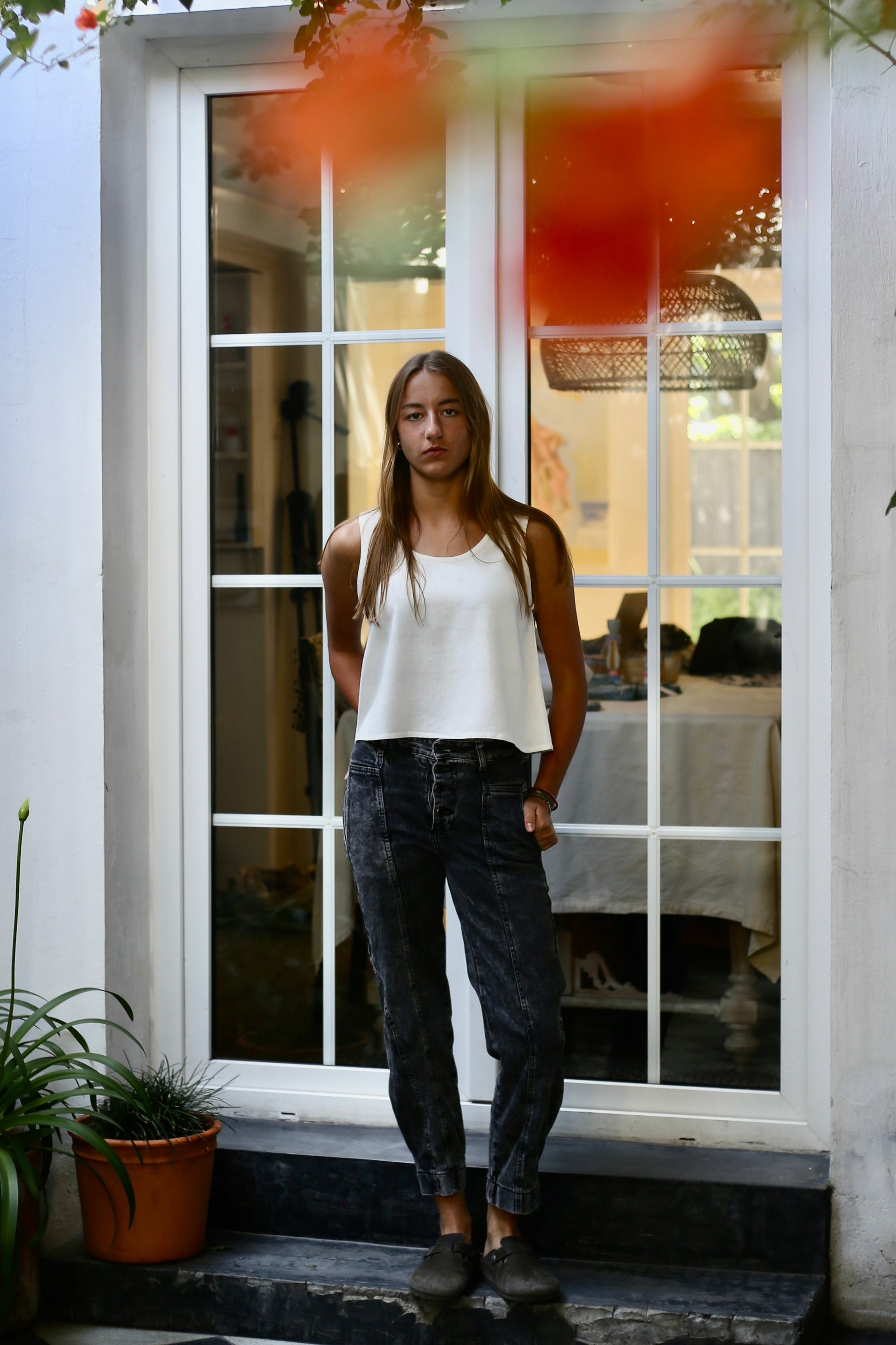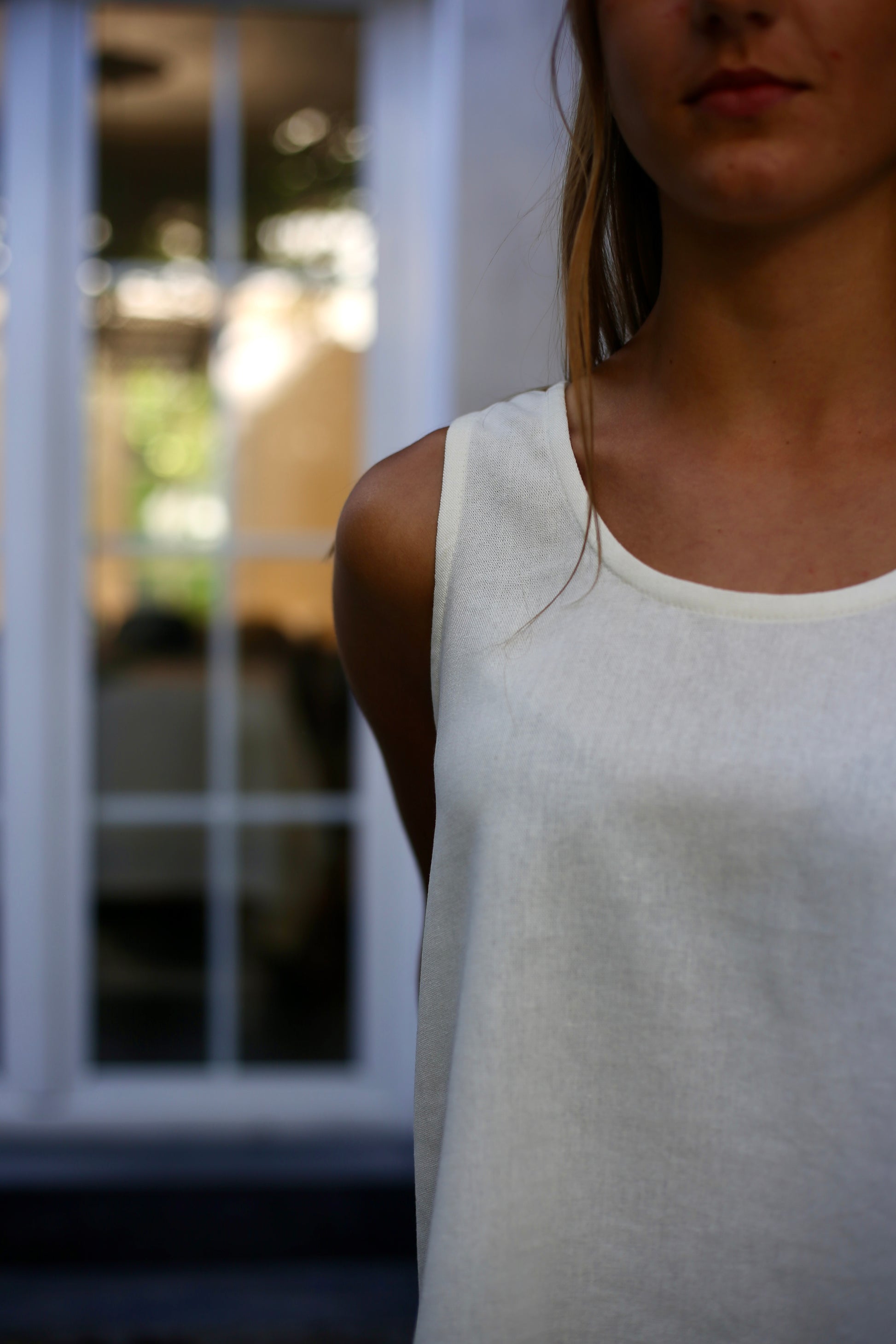 Polera corta sin manga en tela lino algodón, perfecta para estos días de calor. Un básico en tu clóset, combínala con pantalones o faldas tiro alto.