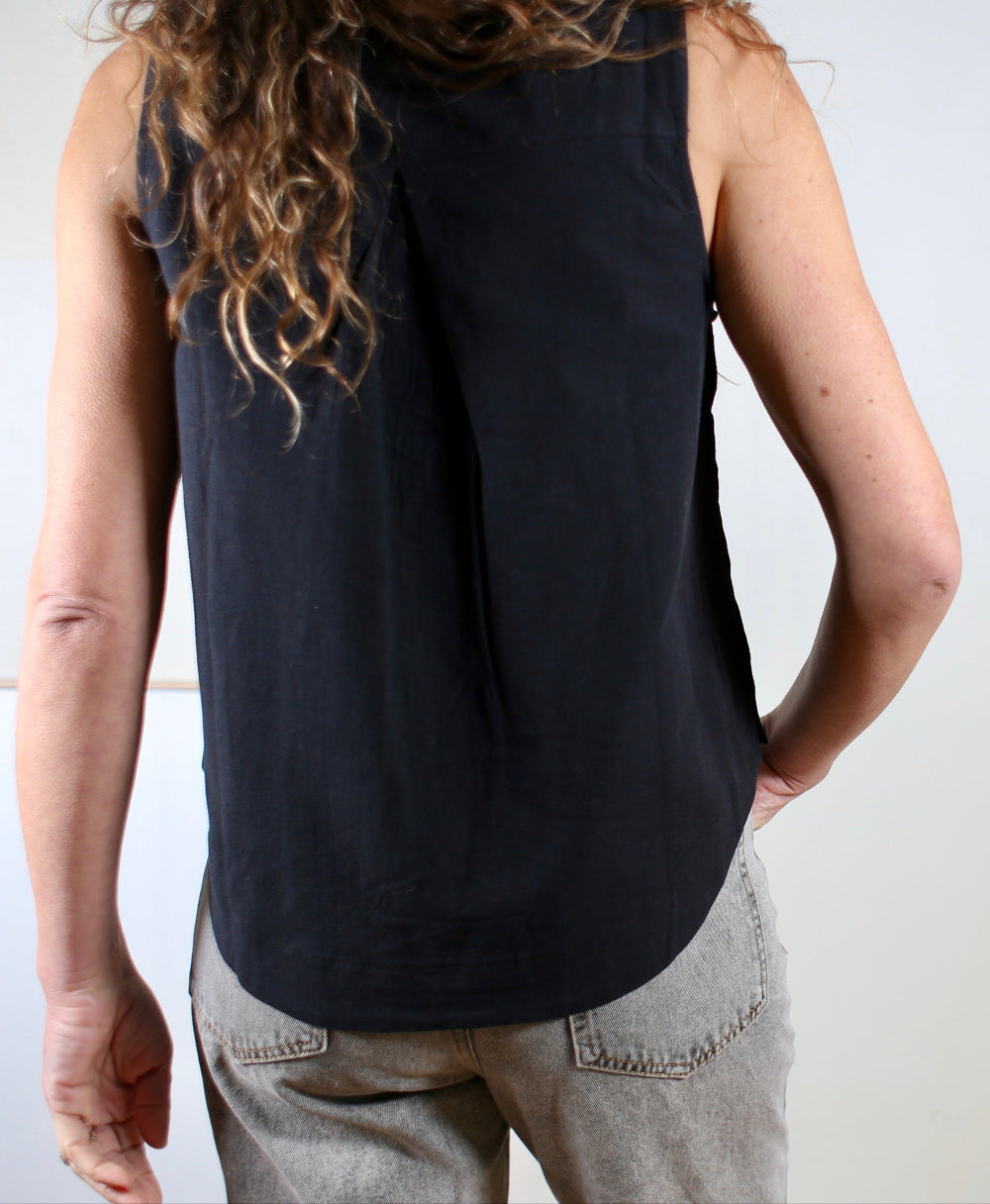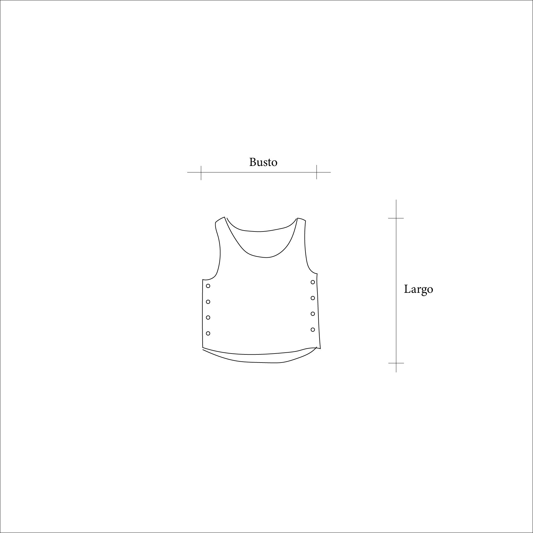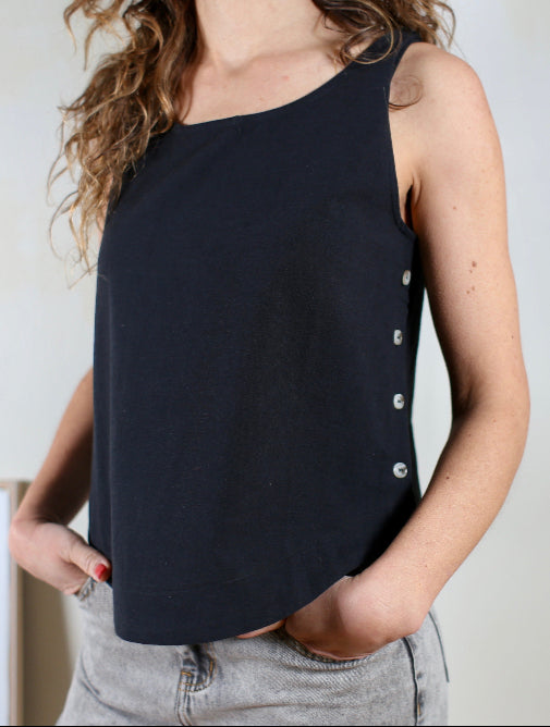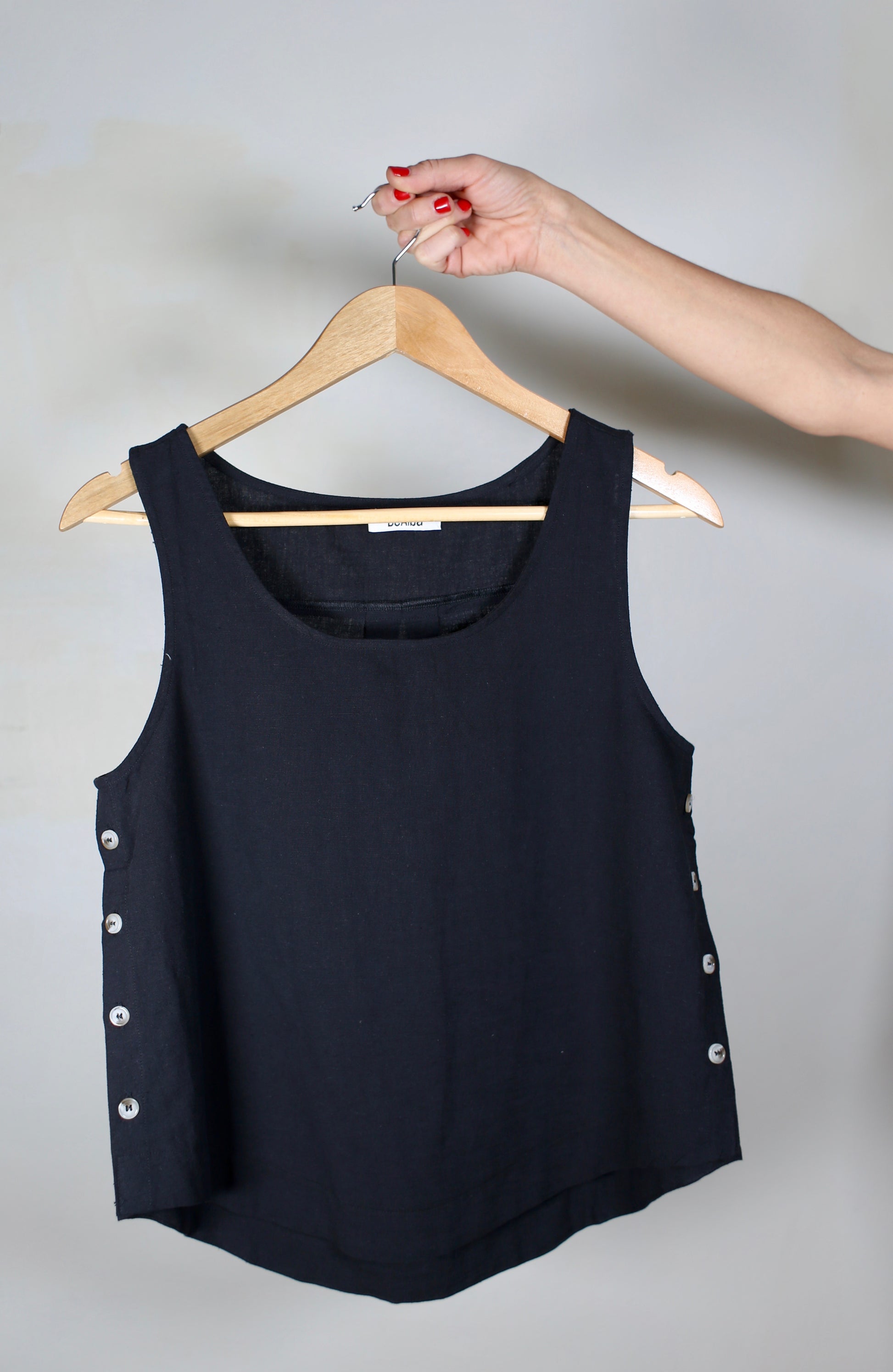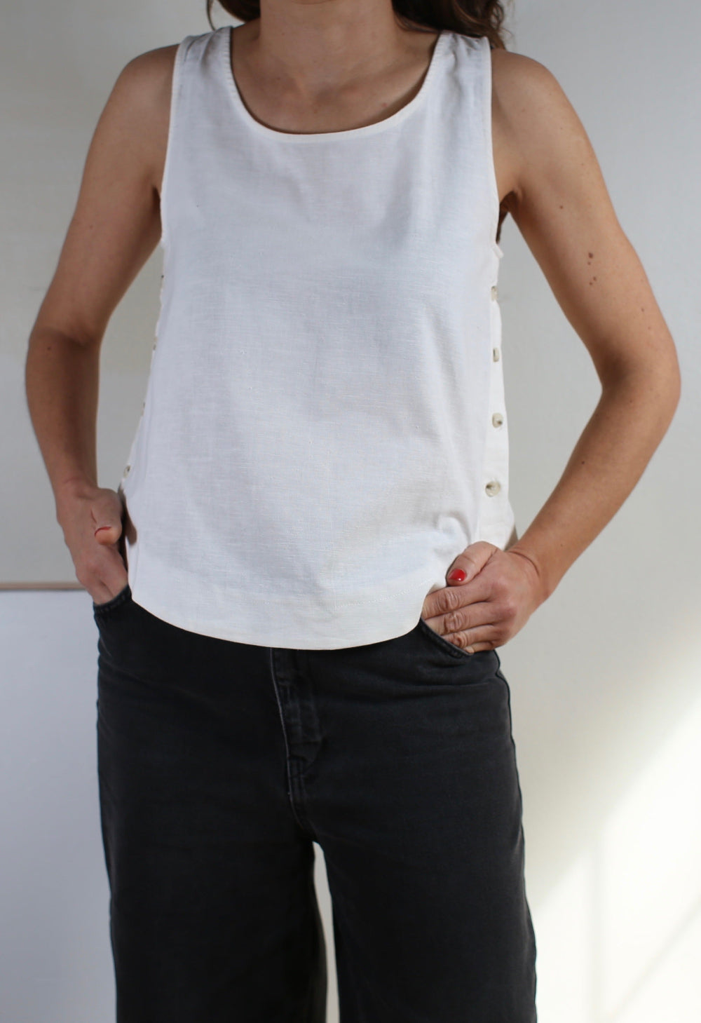 Polera de largo medio, sin manga en lino algodón, con detalles de botones en ambos costados.