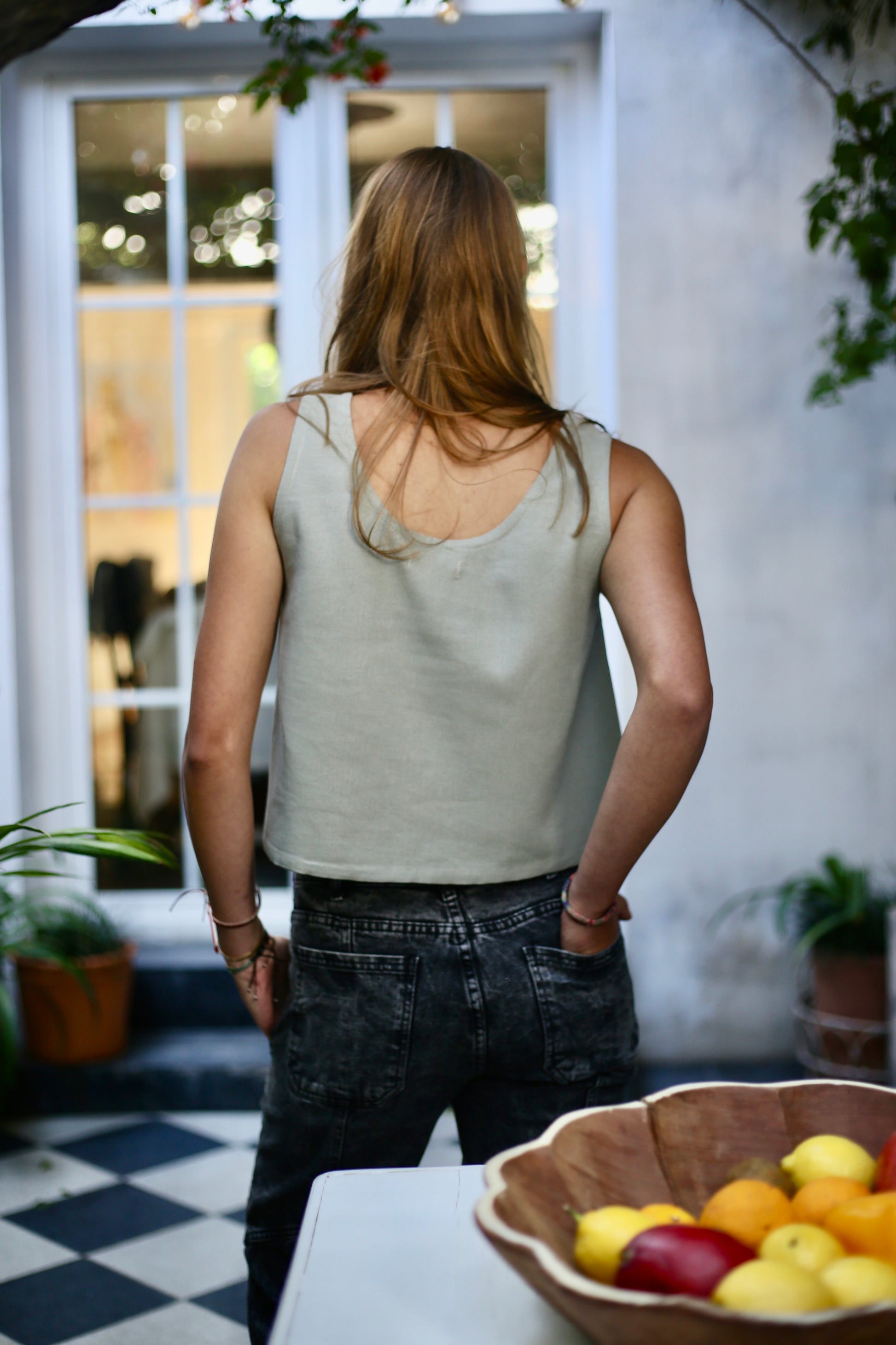 Polera corta sin manga en tela lino algodón, perfecta para estos días de calor. Un básico en tu clóset, combínala con pantalones o faldas tiro alto.