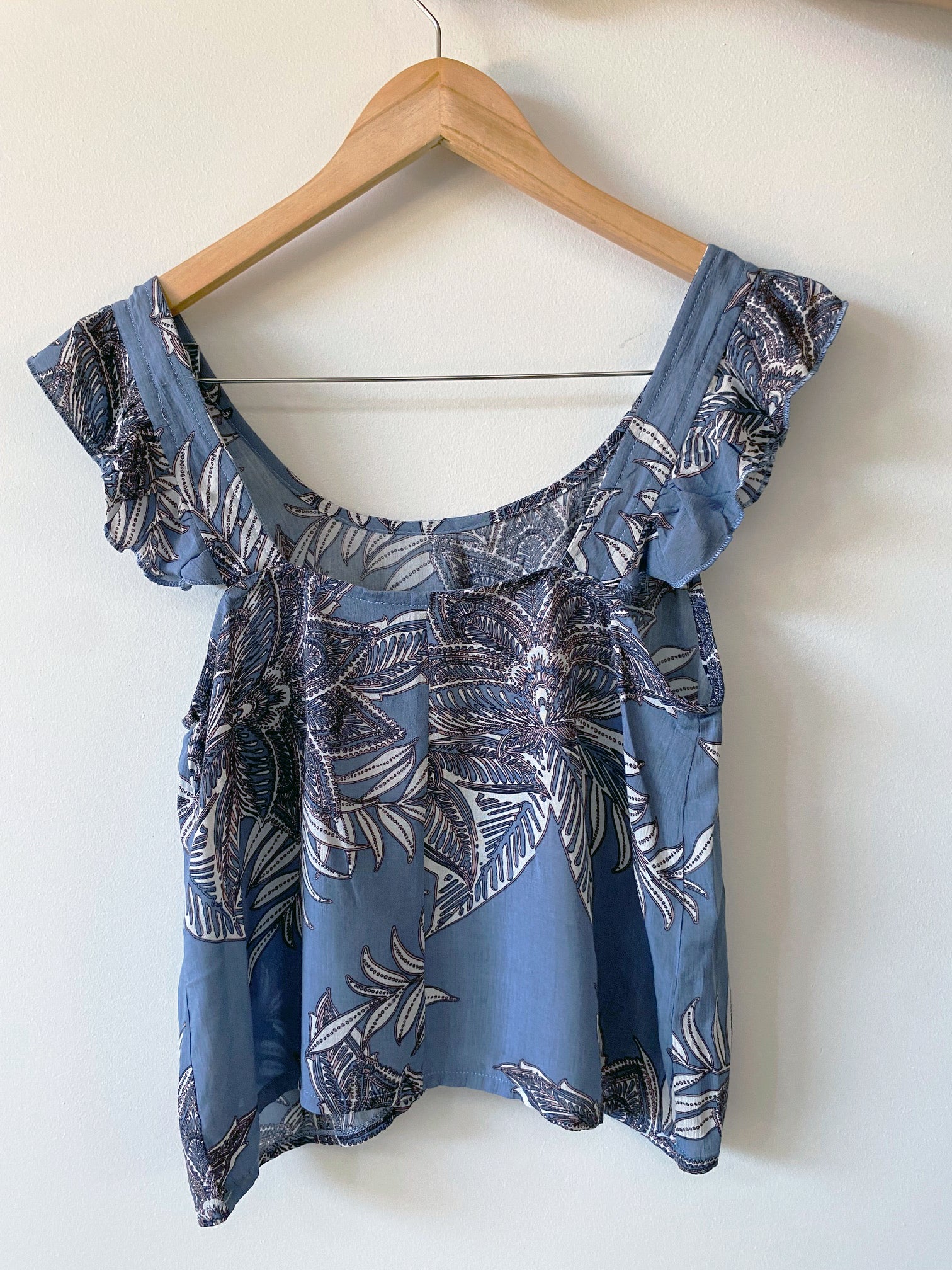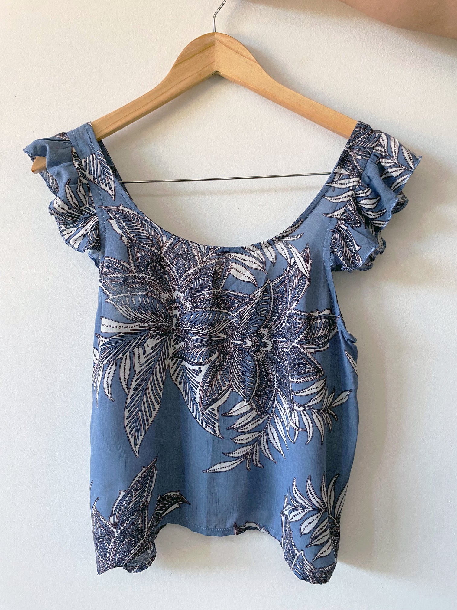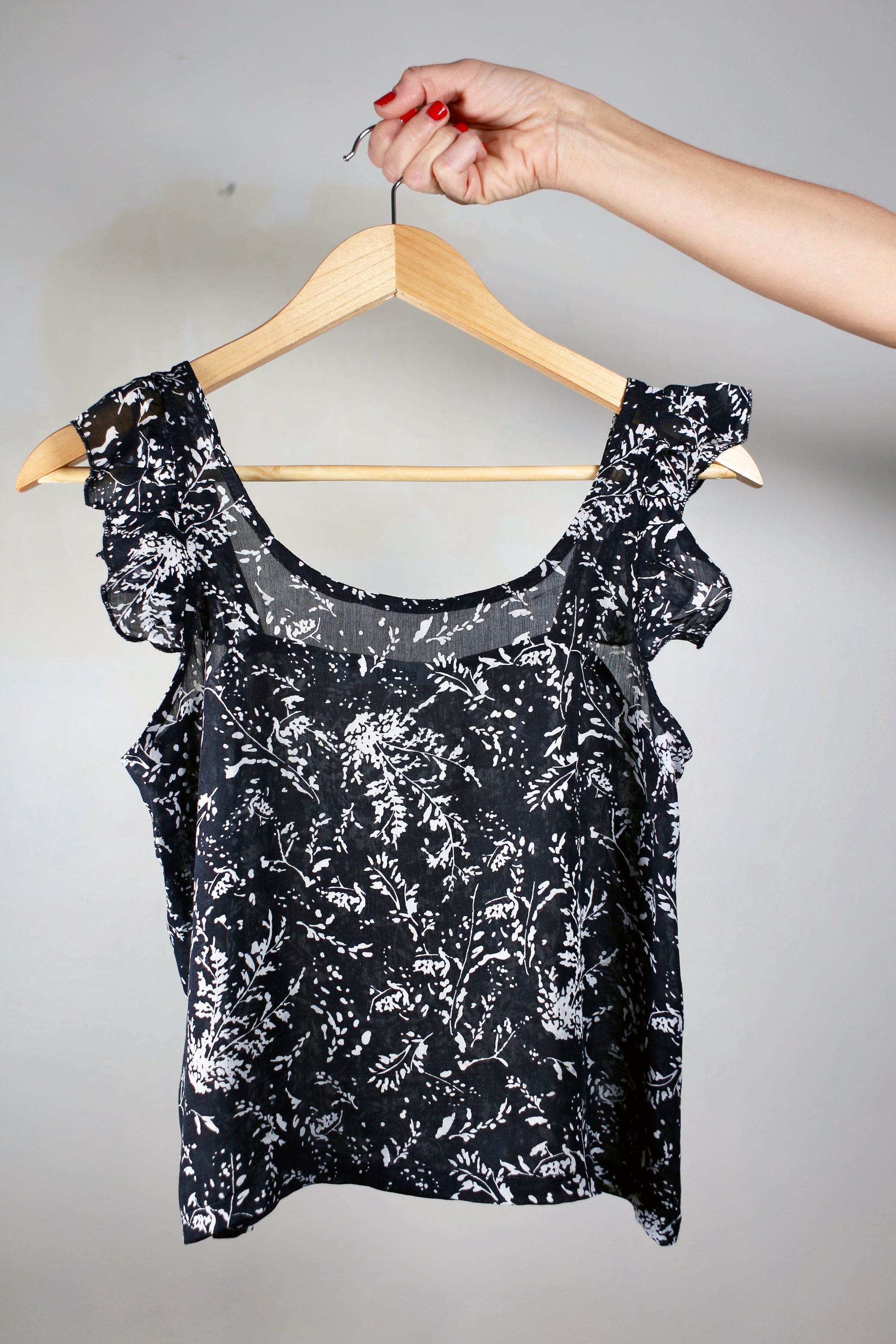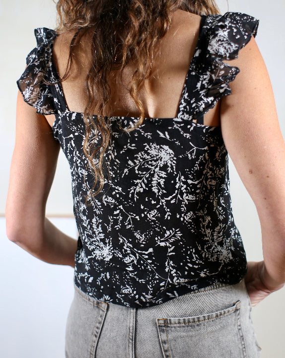 Polera en tela liviana de viscosa corta con detalle de vuelos en los hombros